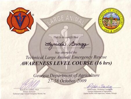 Georgia Dept of Agriculture at their facility in Mansfield, Ga and presented by Dr Rebecca Gimenez, internationally known expert in Large Animal Emergency Rescue.