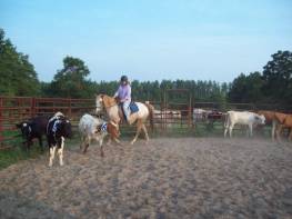 Lynda and Buck have taken up the sport of Ranch Sorting. Buck fell in love with it immediately at his first practice where he was introduced to the cows by veteran rider Cliff Chancey. Buck is totally confident with the cattle, pushing them with his nose when they won't go and guarding the gate fearlessly. It seems he has found his calling :-).